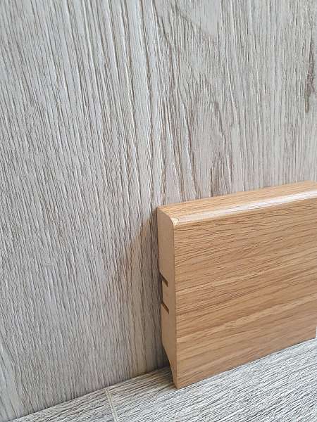 Высота плашек – 80мм. Она позволяет заводить под плинтус стеновые панели и полностью закрывать технические зазоры между стеной и покрытием пола. Можно не выравнивать стены и пол в месте их стыка.
